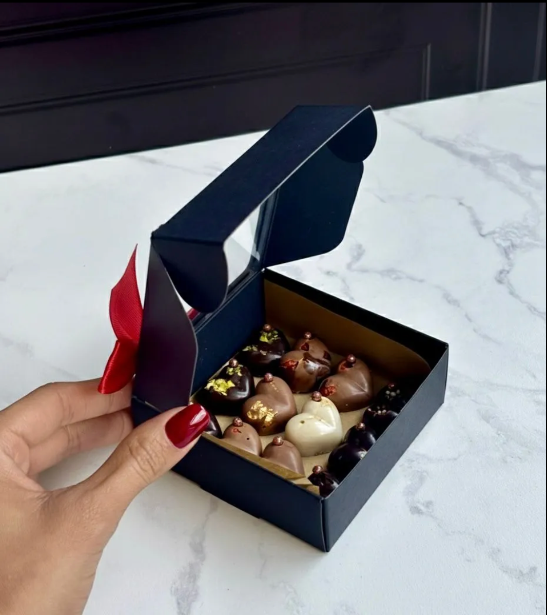 Box of 12 handcrafted chocolate hearts made with Mexican chocolate , in different shades and finishes. Each piece combines design, flavor, and detail, creating a balanced visual and sensory experience.